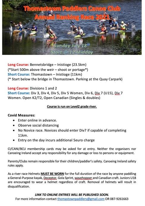 This Sunday 18th July sees the second race of this years Ranking Series with Thomastown Paddlers ranking race on the Nore. This is a great race on a lovely stretch of water. The Div1, Div2 long course starts above Bennetsbridge Weir and runs 23km downstream to Inistioge. All other Divisions run n the shorter 11km course from Thomastown to Inistioge. This is a fantastic stretch of water ot paddle with no weirs but has some flow and small wavy rapids. The flow means the 11km seems much shorter .
