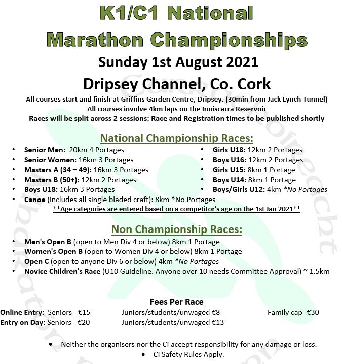As announced earlier in the year we are delighted to have the Long Course Marathon National Championships return to Dripsey, Co. Cork on August 1st. The National Championships were due to take place at this venue last year but were cancelled last minute due to an intercounty travel restriction on the Friday night. The event is being run in conjunction with Phoenix Kayak club & Ciarán Cooke who have ran 2 previous events in Dripsey.