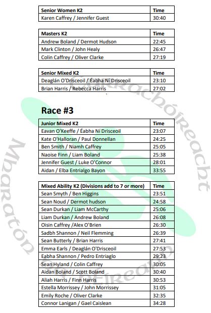 Race2 was the Senior race with Men’s, Women’s, Masters (Over 39) & Mixed races. In the Senior Men the Neil Flemming & David Buggy of Celbridge Paddlers took the win after getting beached in the shallows 500m in . They wound back in the lead crews to over take everyone & get the W. Junior paddler Eavan O’Keeffe teamed up with Alex O’Brien for the sliver. The Women’s saw another Senior/Junior crew as Salmon Leaps Karen Caffrey & Jennifer Guest teamed up to take the win. In the Masters race Salmon Leaps Dermot Hudson & Andrew Boland took a great win, competing with the top Senior crews & being 2nd boat home overall. In the Mixed race the Father/daughter crew of Deaglan & Eabha O’Drisceoil powering home for the win