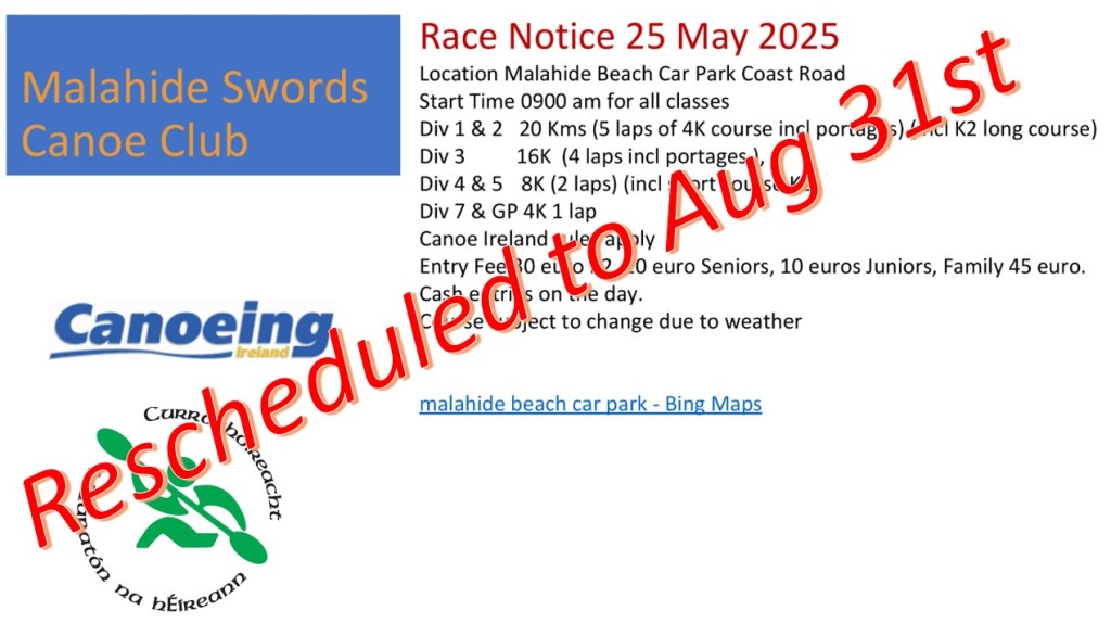 This weekends Malahide race has been postponed & rescheduled for Aug 31st due to the weather. A high Westerly wind wind is forecast with gusts > 60kph. Due to the high winds & the direction of the wind the decision was made to reschedule the race with the safety of ALL competitors in mind.