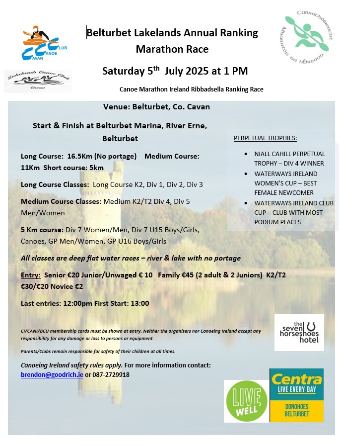 These weekend sees the Annual Belturbet Ranking race run by Cavan Canoe Club. This race takes place on a stunning stretch of water & is renowned for the excellent hospitality after the race. It is also a race that has a number of perpetual trophies up for grabs some of which date back almost 40 years since they were 1st given out. All details on the revised race notice below.